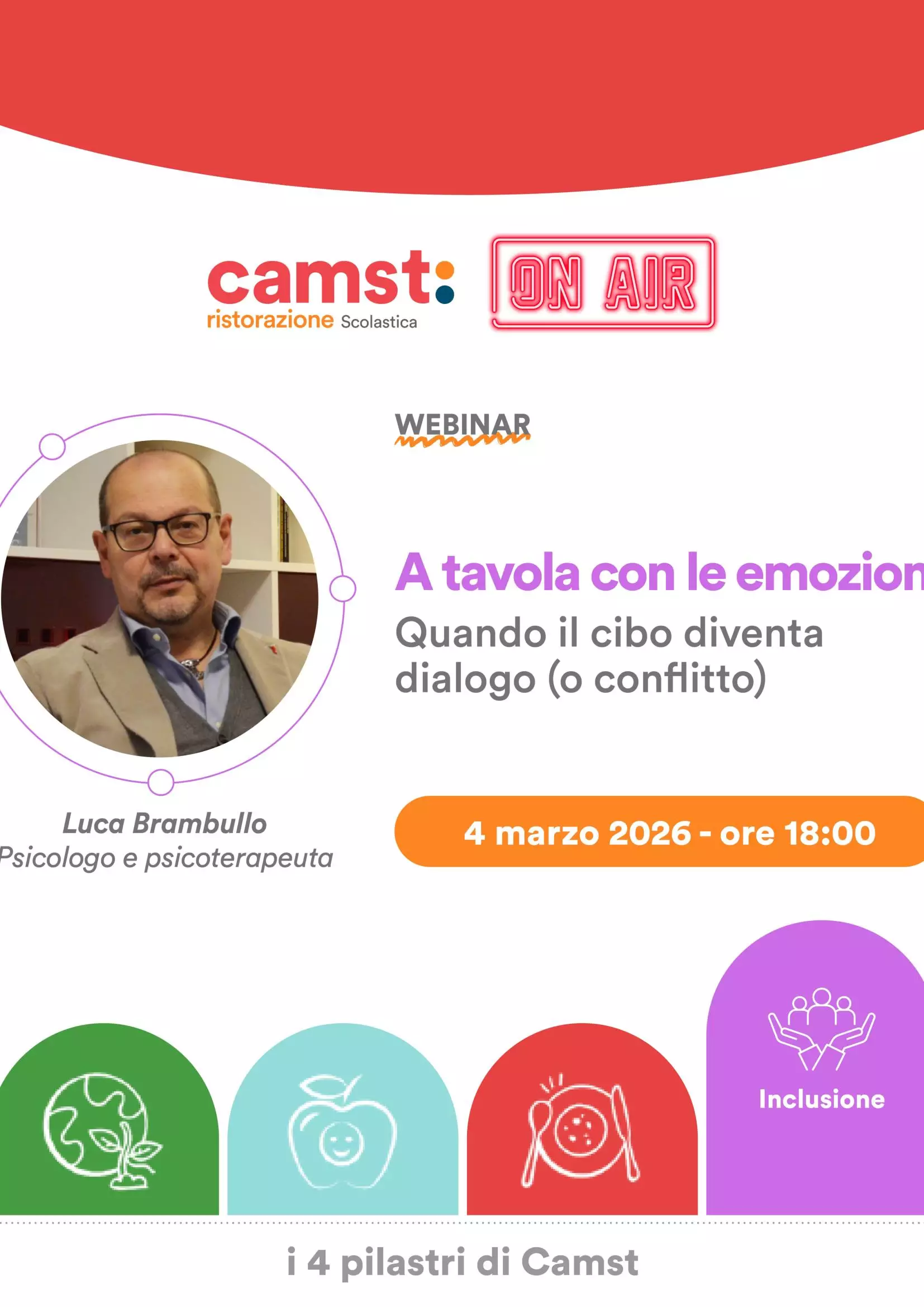 Descrizione Si pubblica la locandina con il link per l'iscrizione al prossimo webinar "Camst on air" dal titolo "A tavola con le emozioni - Quando il cibo diventa dialogo (o conflitto) familiare" che si terrà il 4 marzo 2026 - Ore 18:00.