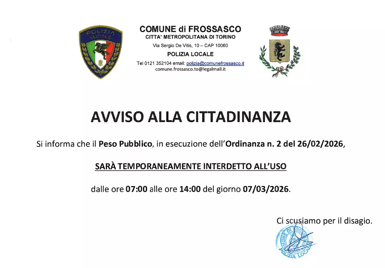 Si informa che il Peso Pubblico, in esecuzione dell’Ordinanza n. 2 del 26/02/2026,